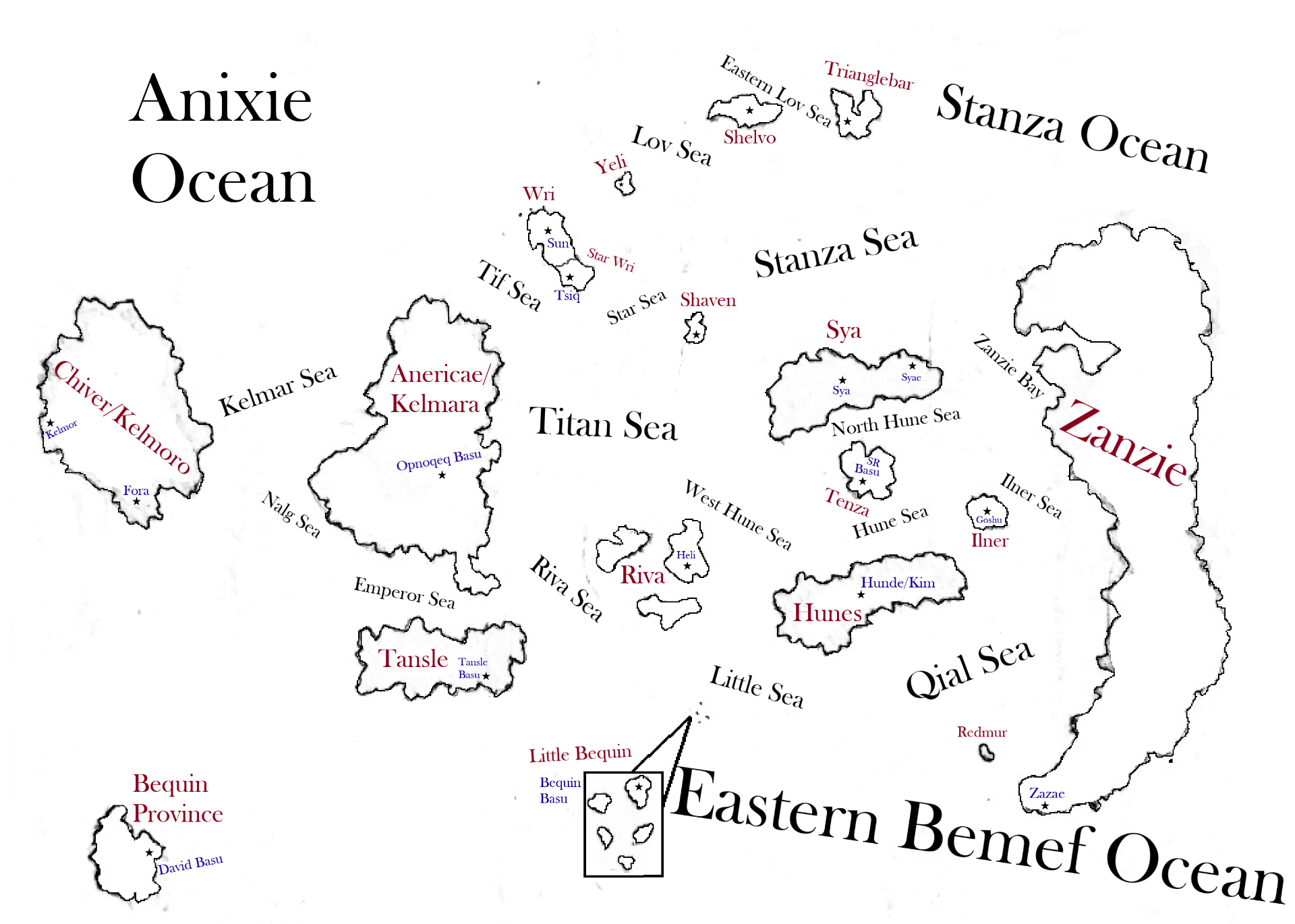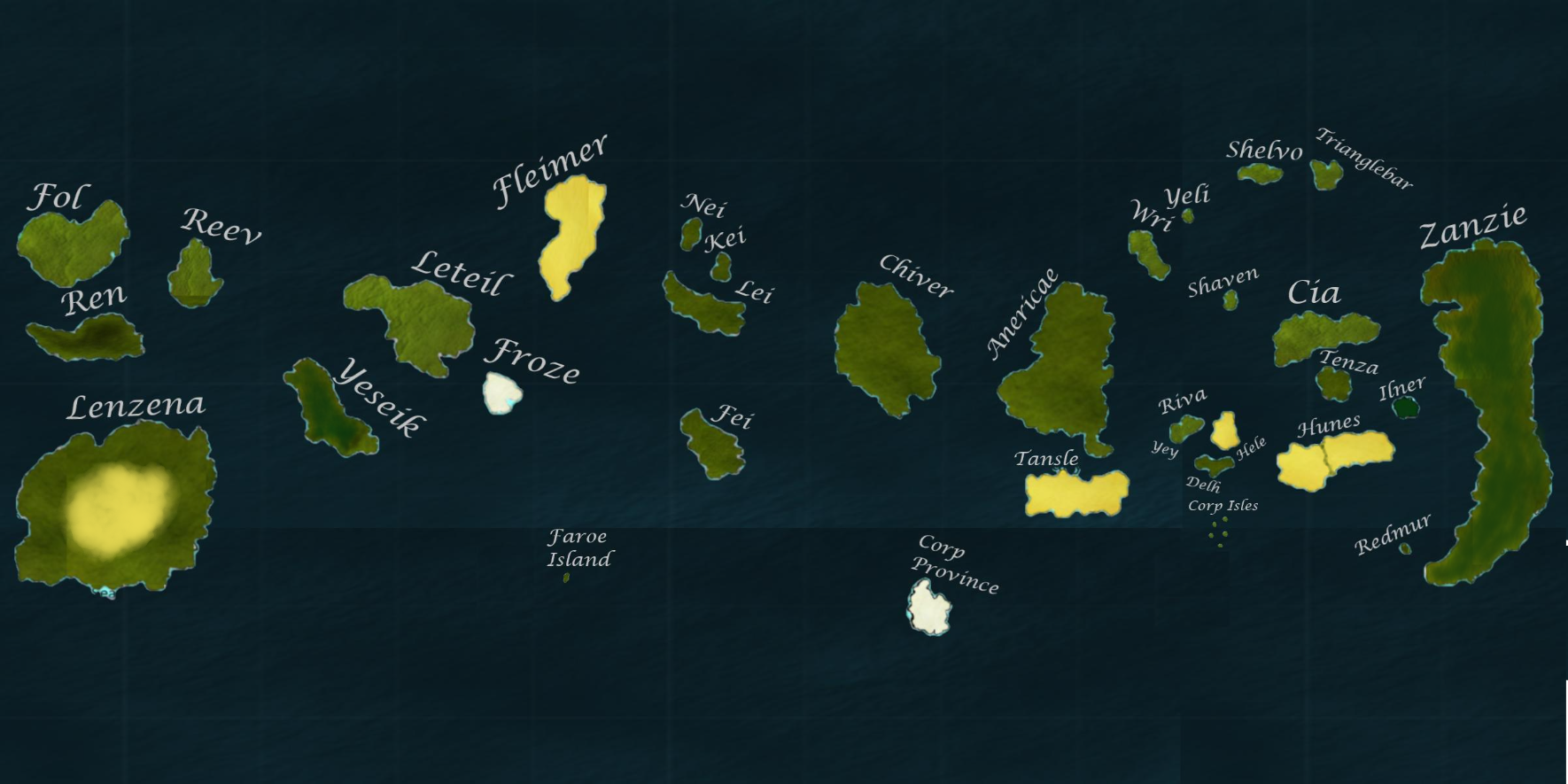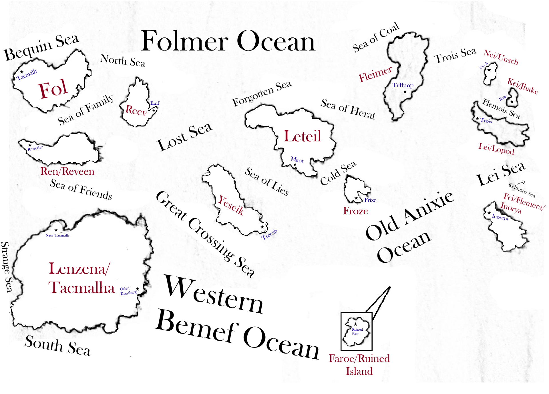 Bequin-Veqef is the dominant branch of the Tacmalh language. Forgotten is a branch of Ribbletanian. Zanzae is an independent dialect. Hunde shares history with Tacmalh as well as Zanzae. Zanzae is more complicated than the others, you need to use the letters to form a word, then you must combine all the letters into one to form a single letter (Sort of like Chinese). You can be a little more creative with Zanzae as it is a less strict script.