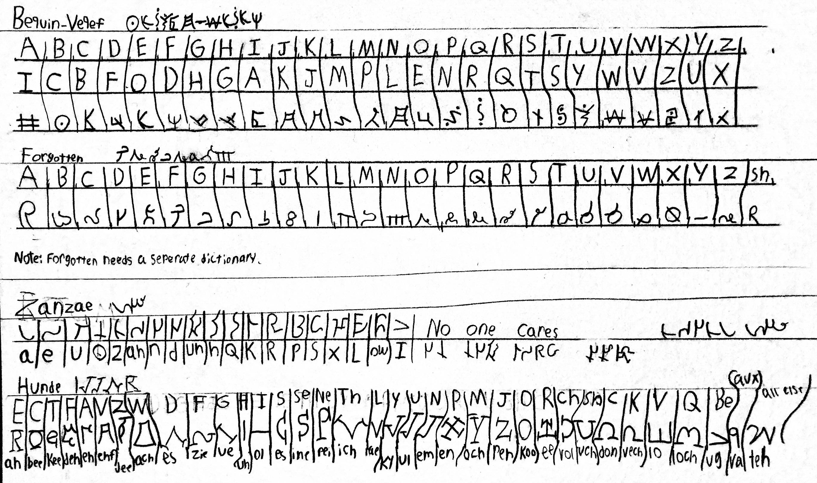 Bequin-Veqef is the dominant branch of the Tacmalh language. Forgotten is a branch of Ribbletanian. Zanzae is an independent dialect. Hunde shares history with Tacmalh as well as Zanzae. Zanzae is more complicated than the others, you need to use the letters to form a word, then you must combine all the letters into one to form a single letter (Sort of like Chinese). You can be a little more creative with Zanzae as it is a less strict script.